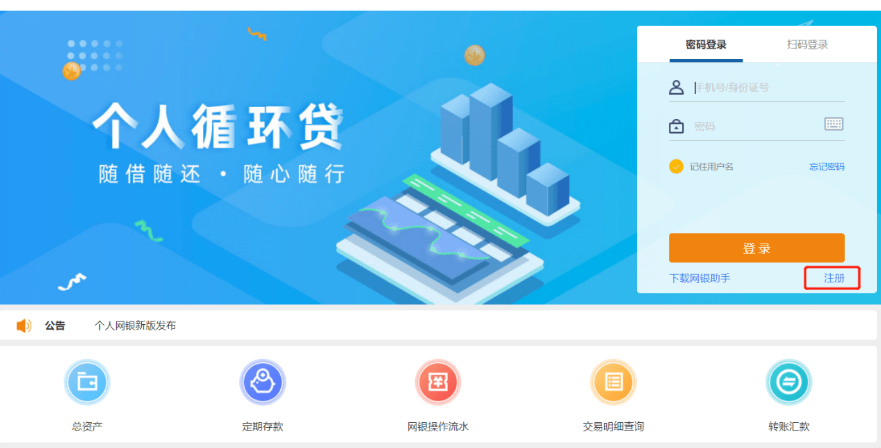 打开个人网银首页,点击右上角“注册”按钮,进入用户注册页面。