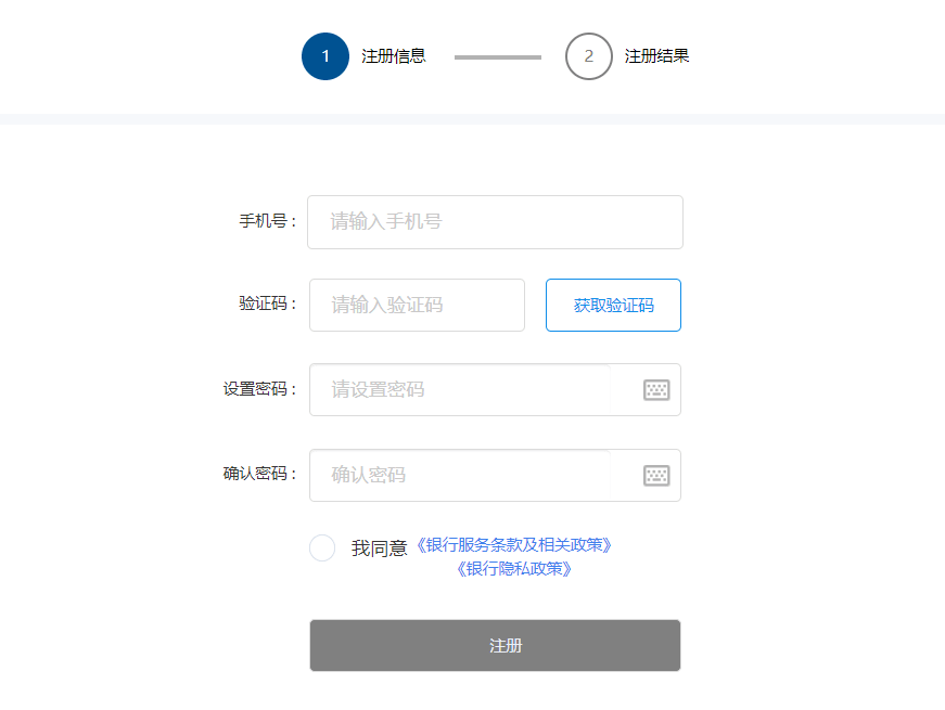 输入手机号、获取短信验证码并输入、设置网银登录密码并重复一遍,阅读并勾选“同意银行服务条款与相关政策”,点击“注册”按钮。